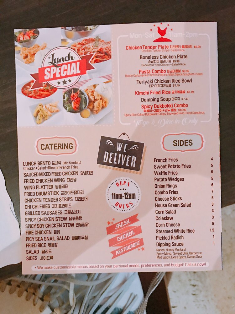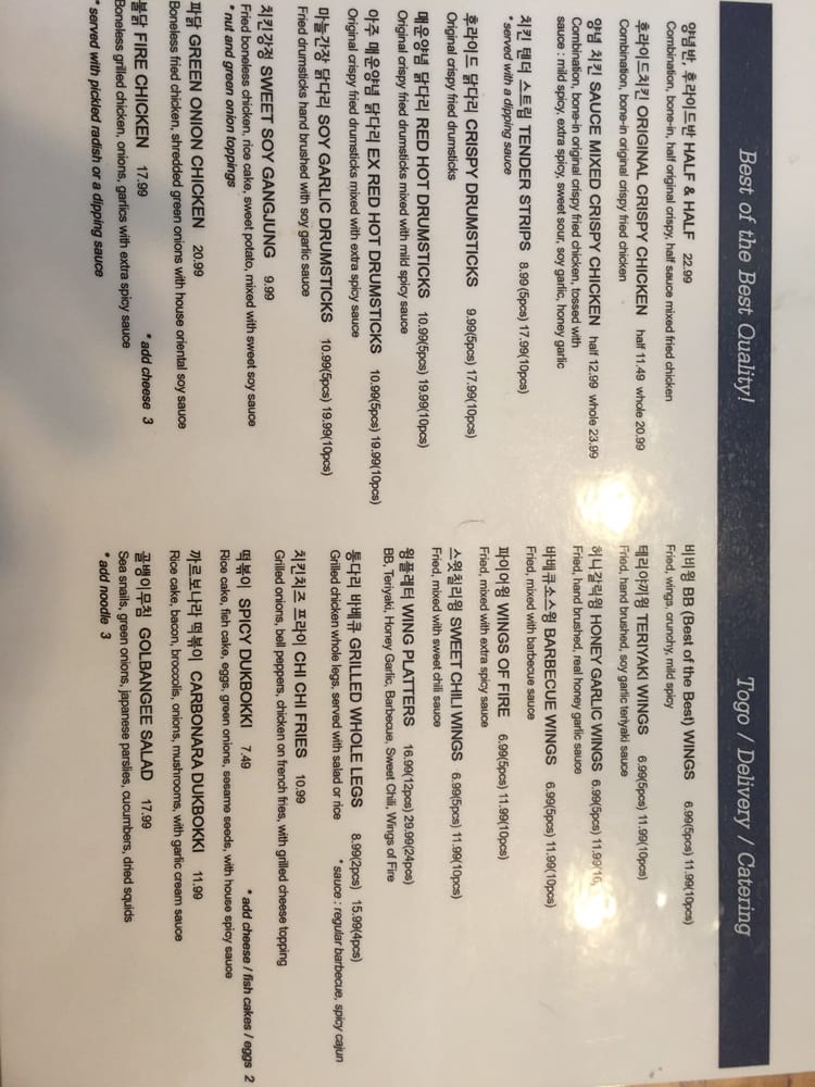 Not to be missed are the Ddeok-Bokki options, with their signature sweet and spicy sauce. Beyond the wings, the focus on friendly service and a welcoming atmosphere enhances the dining experience whether you choose to dine in or opt for takeout.